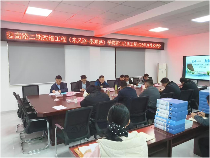 2025年11月4日,泰州市公路水运平安百年品质工程专家组一行莅临姜高路二期项目部,开展2025年度技术评价工作。本次考评严格遵循江苏省公路水运平安百年品质工程评价标准(2025版)。平安百年品质工程创建工作旨在贯彻落实“交通强国”战略,深化交通运输现代化示范区建设,提升交通工程质量安全管理水平。