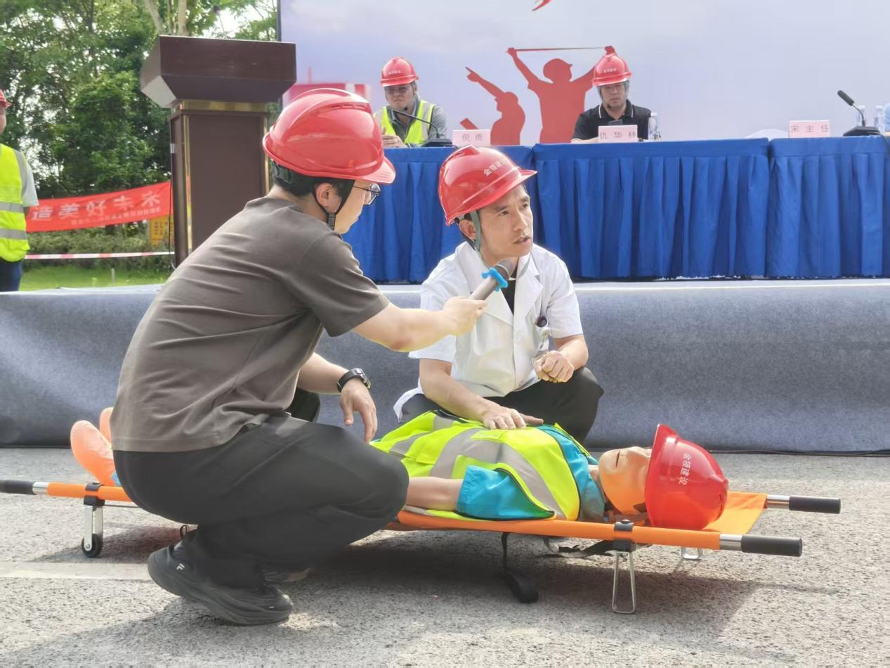 事故模拟:桩基施工过程中,电焊工未通知电工擅自接电,因手部潮湿且未佩戴绝缘手套,导致触电事故。同伴立即切断电源,救援人员迅速对“伤者”进行心肺复苏并及时转运伤员。