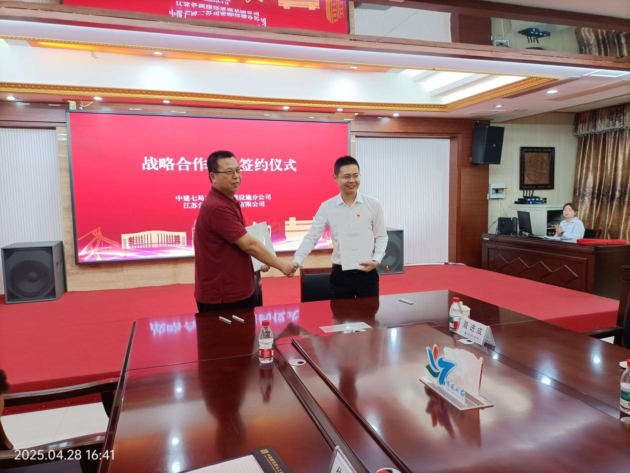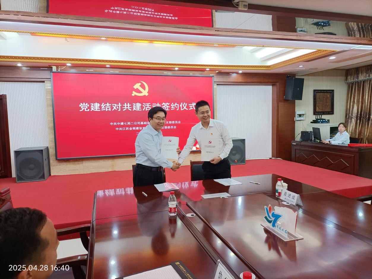 为深化党建引领作用,推动工程建设高质量发展,2025年4月28日,中共江苏金领建设发展有限公司支部委员会与中共中建七局二公司基础设施分公司总支部委员会在宁盐高速NY-TZ1标段项目部举行党建共建签约活动。双方以“资源共享、优势互补、合作共赢”为目标,共同签署党建共建协议及战略合作备忘录,开启企业联动新篇章。